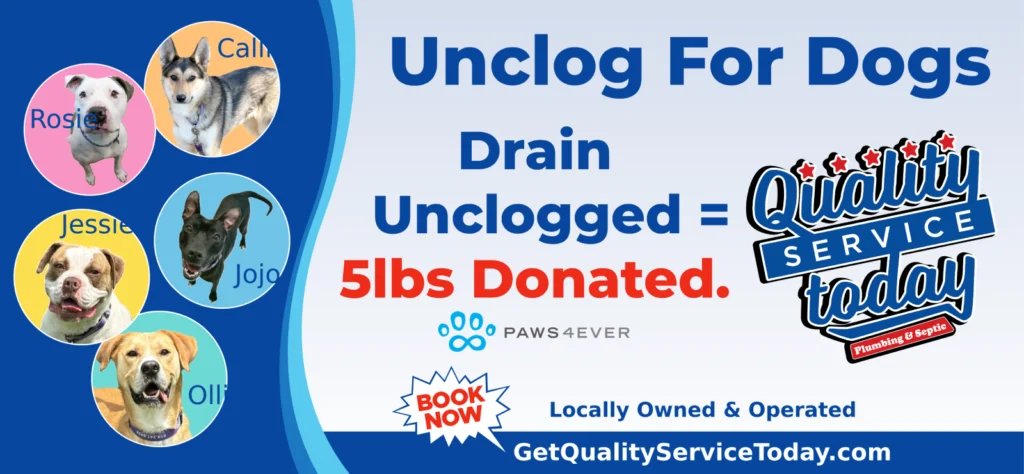 At Quality Service Today, we’re not just clearing clogs — we’re making tails wag across the community! We’re excited to introduce Unclog 4 Dogs, our newest way of giving back. For every drain we unclog, we donate 5 pounds of dog food to Paws4ever, a local no-kill animal shelter devoted to caring for and rehoming lovable dogs right here in our community.